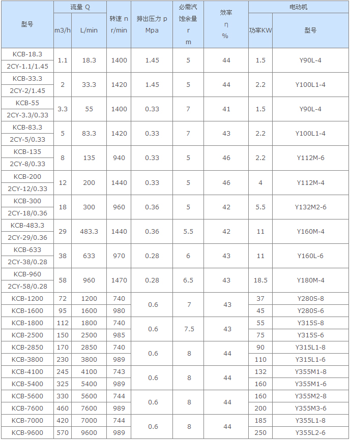 KCB型齒輪泵適用于輸送不含固體顆粒和纖維,無(wú)腐蝕性,溫度不高于80℃,粘度為5×10-6~1.5×10-3m2/s (5-1500cSt)的潤(rùn)滑油或性質(zhì)類(lèi)似潤(rùn)滑油的其他液體。