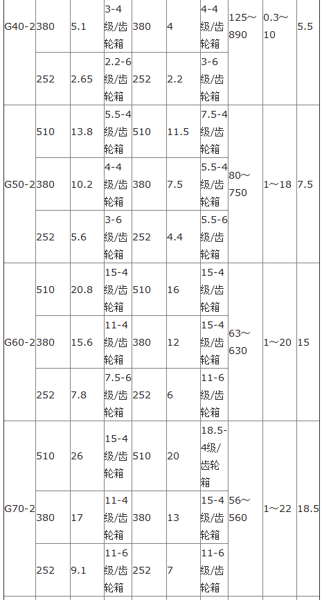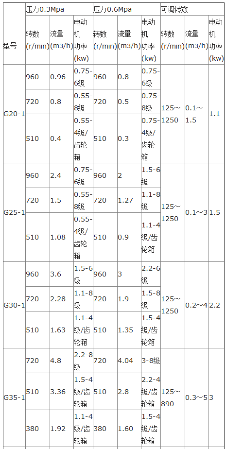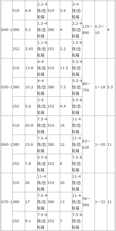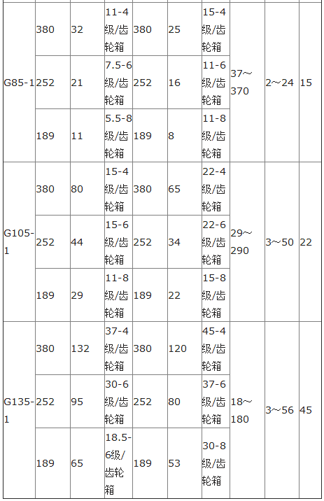 單級,由齒輪變速、電磁調速電機加齒輪變速或無級變速電機加齒輪變速時的性能參數(shù)