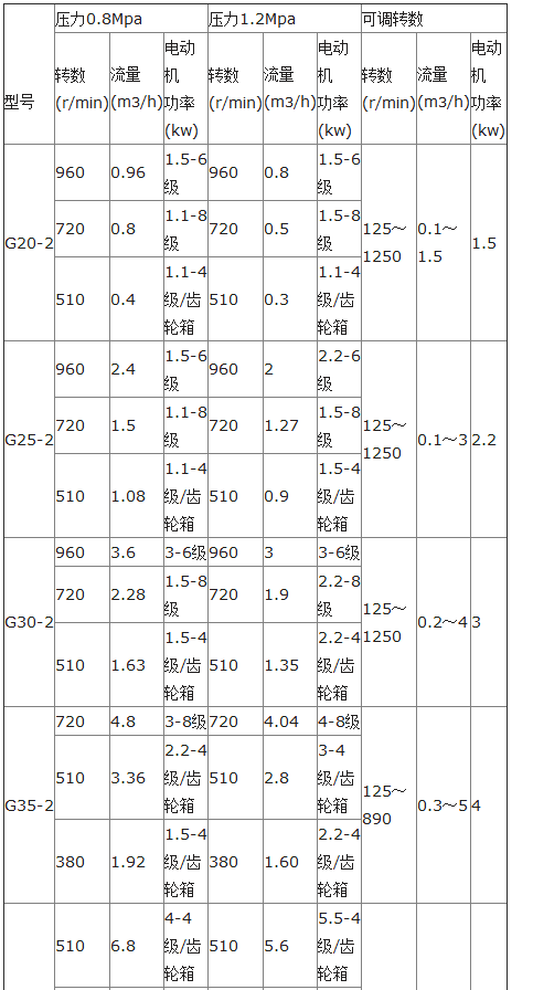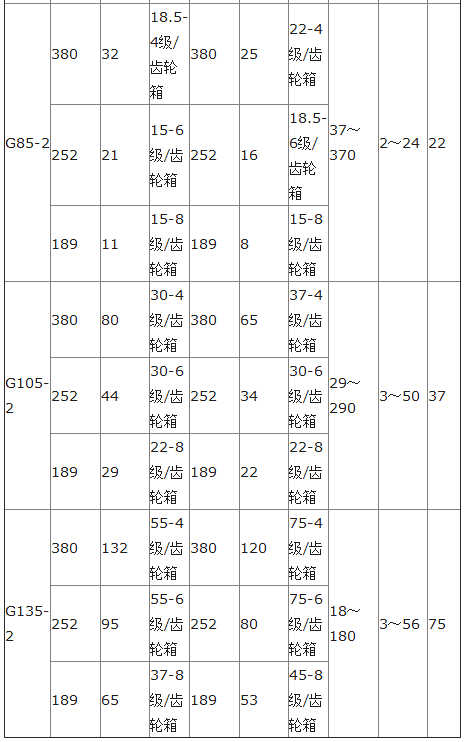 雙級,由齒輪變速、電磁調速電機加齒輪變速或無級變速電機加齒輪變速時的性能參數(shù)